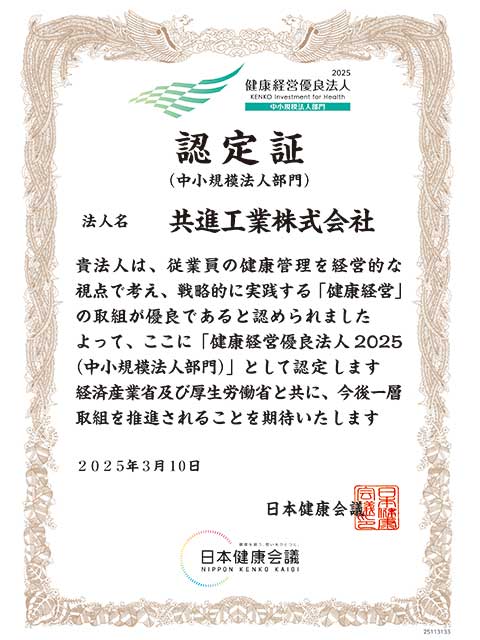 今年度も健康経営優良法人に認定いただきました。社員の健康を考え、会社独自の取組みも始めました。 お知らせ よかったらシェアしてください URLをコピーしました! 関連記事 健康と日常を支える新たな福利厚生を開始 2025年4月18日 中学生バスケットボールクラブに寄付を行いました 2025年4月4日 お味噌汁デー 2025年4月3日 安全祈願祭 2025 2025年4月1日 キャッシュレス決済② 2024年8月29日 職場環境改善宣言企業 認定証 2024年7月4日 キャッシュレス決済 2024年6月13日 HATARAKO 北海道就業応援BOOK誌面 2024 2024年6月10日